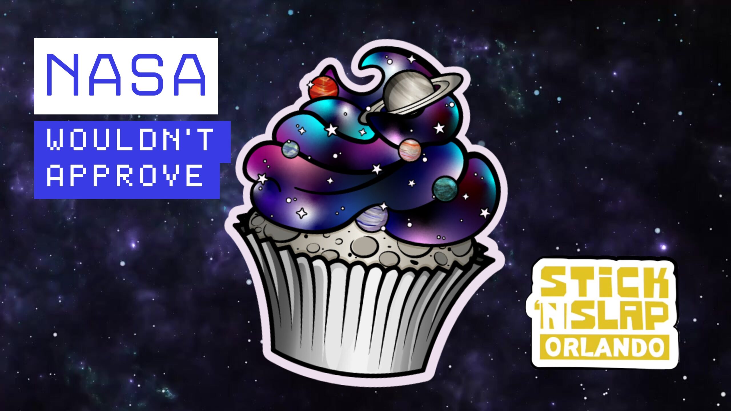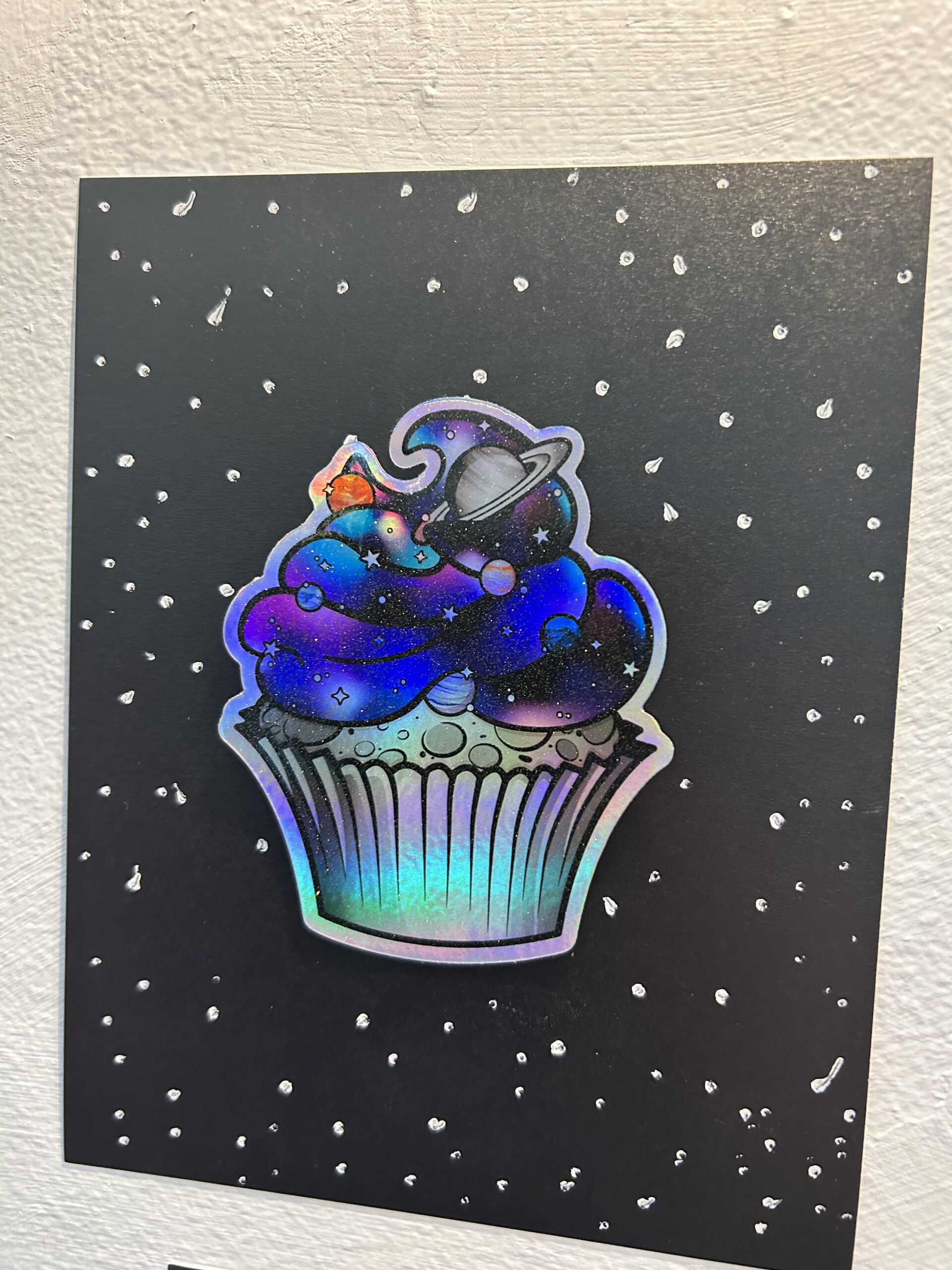 This space cupcake is printed on holographic vinyl and topped with a glitter laminate that twinkles like tiny stars. Shiny. Sparkly. Mildly unhinged. NASA would have concerns.